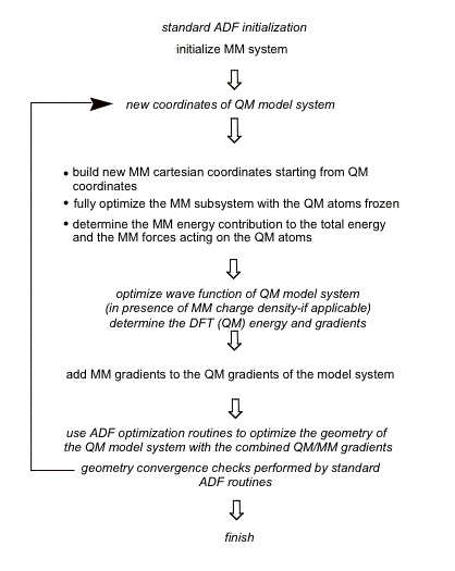 The basic philosophy of the ADF QM/MM implementation has been to treat the MM region as a perturbation to the QM model system. The atoms of the QM model system are controlled by ADF as they would in a regular pure QM run, whereas the MM atoms are treated ‘separately’. For example, when geometry optimization is performed, the Hessian matrix is only generated / updated for the QM model system. This is possible because at each geometry step the MM subsystem is fully optimized (with the QM and LI atoms frozen). One should be aware however that there are not necessarily six zero eigenvalues of the Hessian, as the QM system is coupled to the MM system (and therefore not free to rotate/translate !). When internal coordinates are used to define the structure of the complex, the atoms of the QM model system are optimized using the internal coordinate system, whereas the MM subsystem is fully optimized at each step within the Cartesian coordinate system. Figure 1-6 shows the flow control of the ADF QM/MM implementation.
