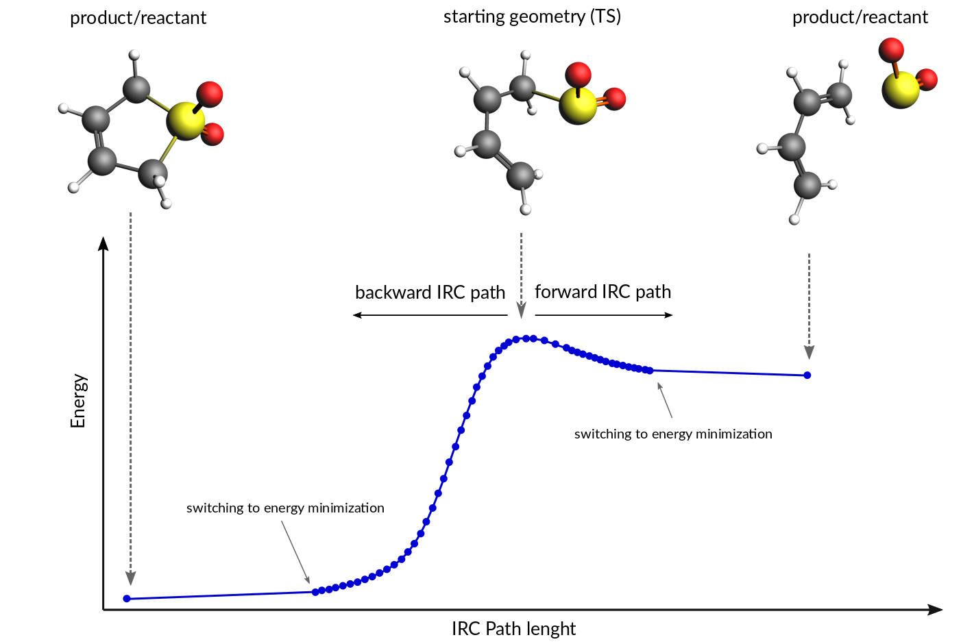 The path of a chemical reaction can be traced from the transition state (TS) to the products and/or reactants using the Intrinsic Reaction Coordinate (IRC) method [1] [2]. The method assumes that the starting geometry is a fair approximation of the TS. A minimum energy profile (MEP) is defined as the steepest-descent path on the potential energy surface from the transition state down towards a local minimum. An IRC path is defined similarly but in the mass-weighted coordinates [3], which means that instead of the steepest descent direction it follows that of the maximum instantaneous acceleration. This makes IRC somewhat related to the Molecular Dynamics method. The energy profile is obtained as well as the length and curvature properties of the path, providing the basic quantities for an analysis of the reaction path.