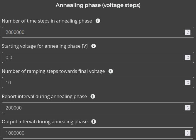 The total duration of the voltage ramp is specified in terms of the number of Monte Carlo steps. We will use the first 2 output intervals (as defined in the output settings).
