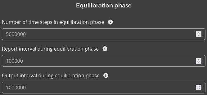 The pre-equilibration is configured in the Annealing and Equilibration tab. We set a number of equilibration steps equal to 5 times the output interval. As with the voltage ramp, custom report and output intervals may be specified during the pre-equilibration stage. As we are interested in the dynamic behavior here, we will use the regular simulation intervals.