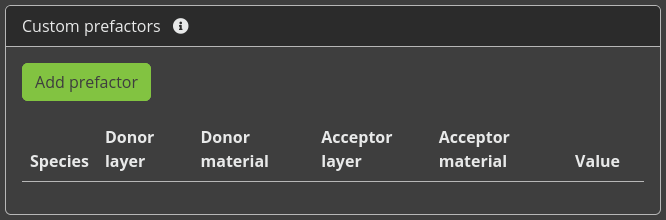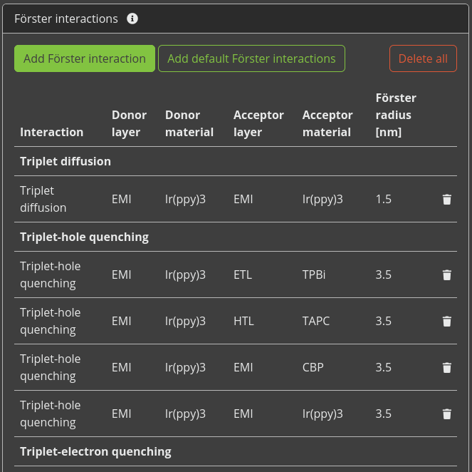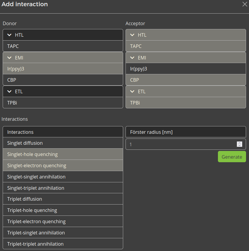 The stack editor now allows us to define the Förster radii. Förster rates are defined for various processes, including diffusion, quenching and annihilation. Because the Förster rates depend on the molecular environment, separate reactions have to be specified for each pair of materials. To streamline this process, the web interface provides the option to automatically configure the most common processes for the current stack. The mechanisms that are included are based on the material templates.
