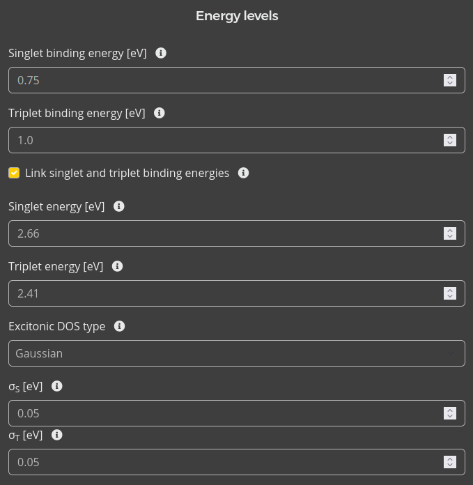 We will set a singlet binding energy of 0.75 eV and a triplet binding energy of 1 eV. By enabling the option to link the singlet and triplet binding energies, the exciton energy levels will be computed automatically based on the exciton binding energy and the HOMO/LUMO levels.
