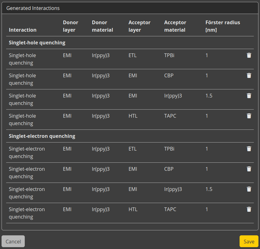 We select Ir(ppy)3 as the donor material, i.e. the material containing the singlet. We then select all 4 materials as possible acceptors. In the list of processes, we select both singlet-electron and singlet-hole quenching. We will specify a Förster radius of 1 nm. Clicking the Generate button will now automatically configure both quenching reactions for each donor-acceptor pair. Each of these processes will have the same Förster radius by default. Selecting the radius of a specific reaction allows you to change the value. Here, we will use a 1.5 nm radius for the quenching reactions inside Ir(ppy)3. Select the Save button to add the reactions to the stack.