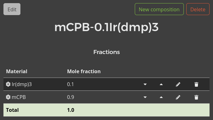 We will create a mixture of 0.9 mCPB and 0.1 Ir(dmp)3. To add a component to the mixture, simply select the material and the desired fraction. The Create Fraction button will add the material to the mixture. It is also possible to adjust or remove fractions that were previously included by selecting the editor icons in the fractions list.