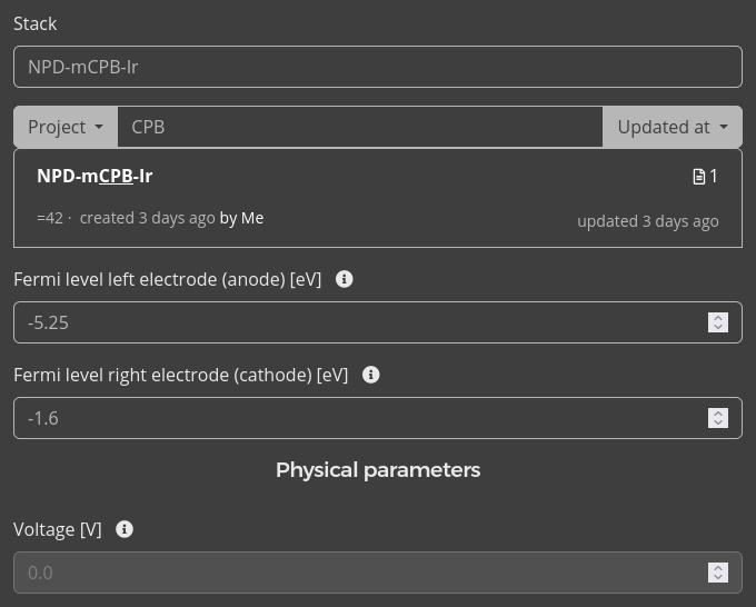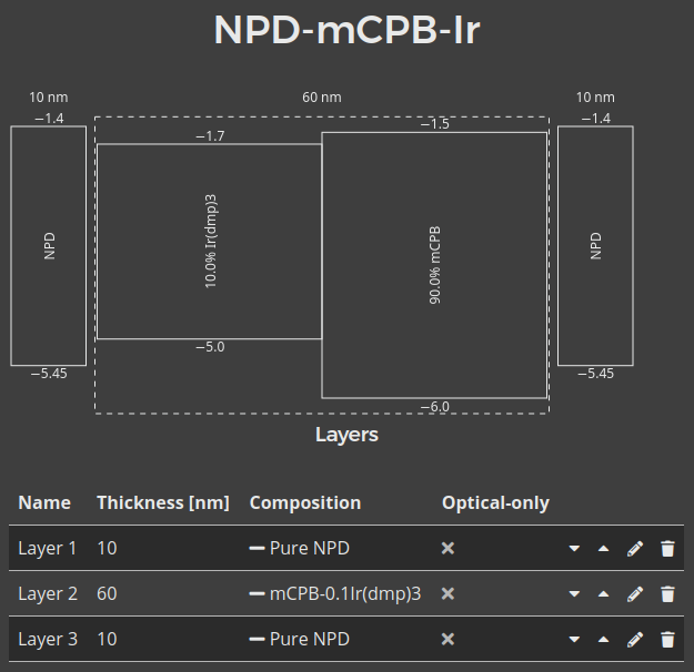 We will create a stack using 3 layers. The outer contact layers are composed of pure NPD. The inner emitter layer contains the host-guest mixture defined earlier.