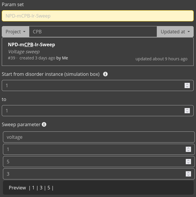 Navigate to the Simulations tab. Specify a name for the simulation and check that the correct server is selected for running the job. Then, select the voltage sweep parameter set created in the previous step. For tutorial purposes, we can set the disorder instances to 1.