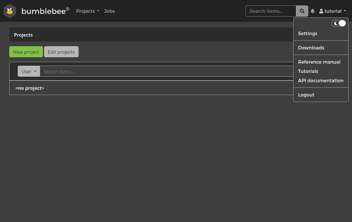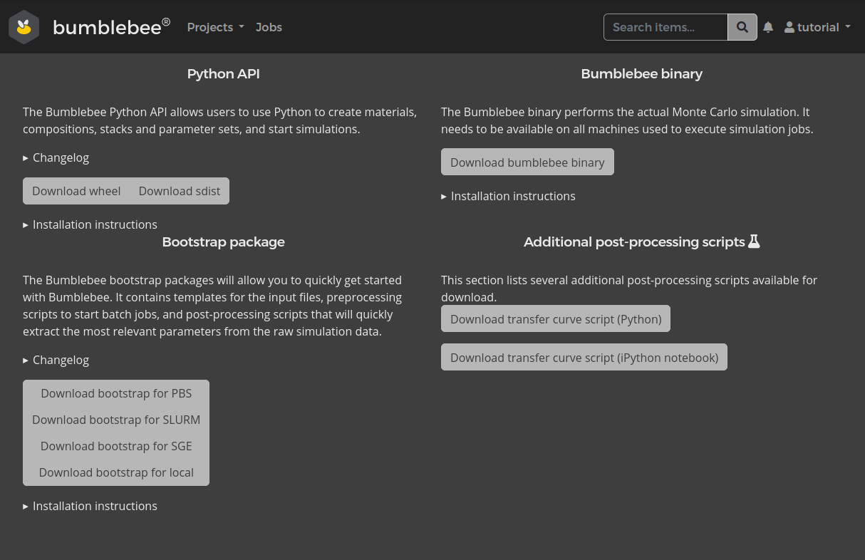 The Bumblebee executable can be obtained from the Downloads tab in the web interface. Clicking on your username will open a menu, from which you can access Downloads.