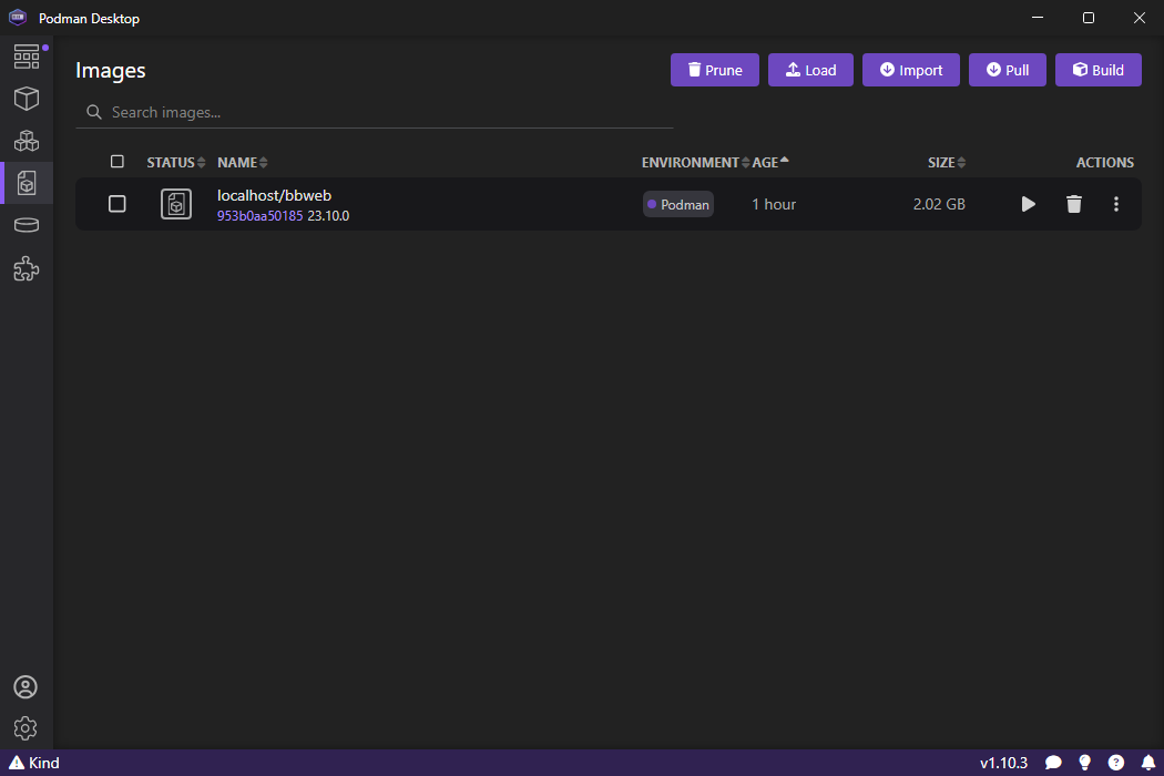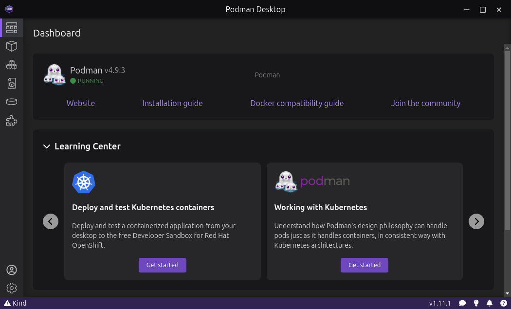 Open Podman Desktop. On the Dashboard page, there should be a Podman widget with the Running status. If this is not the case, follow the instructions in the previous step to set up Podman