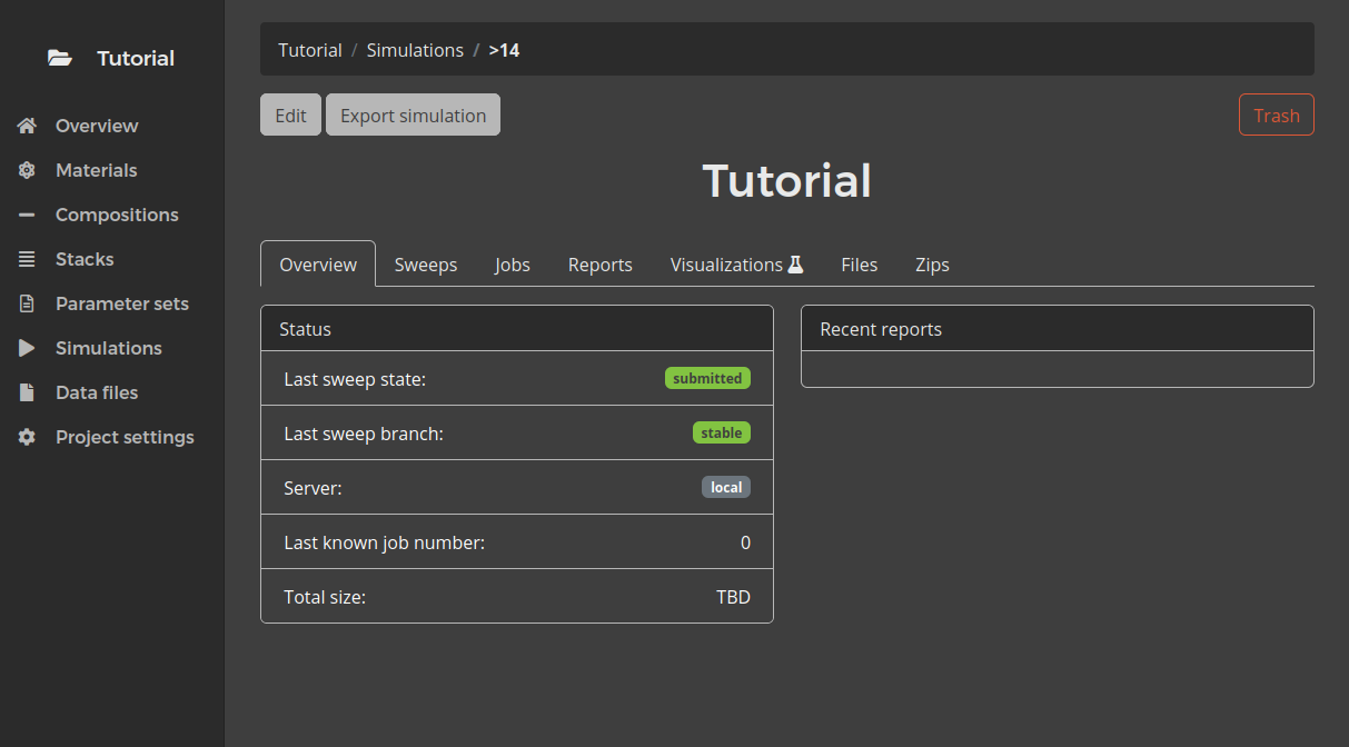 See the Tutorials page in the web interface to setup your first simulation. The simulation status should change to submitted to indicate that your job is now running on the server.