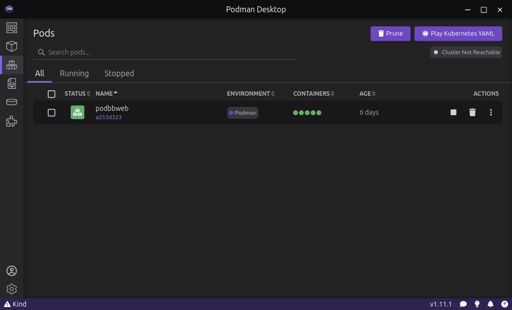 When restarting Podman Desktop, you may need to click on the Start Pod button (indicated by the play icon) before the web interface will load