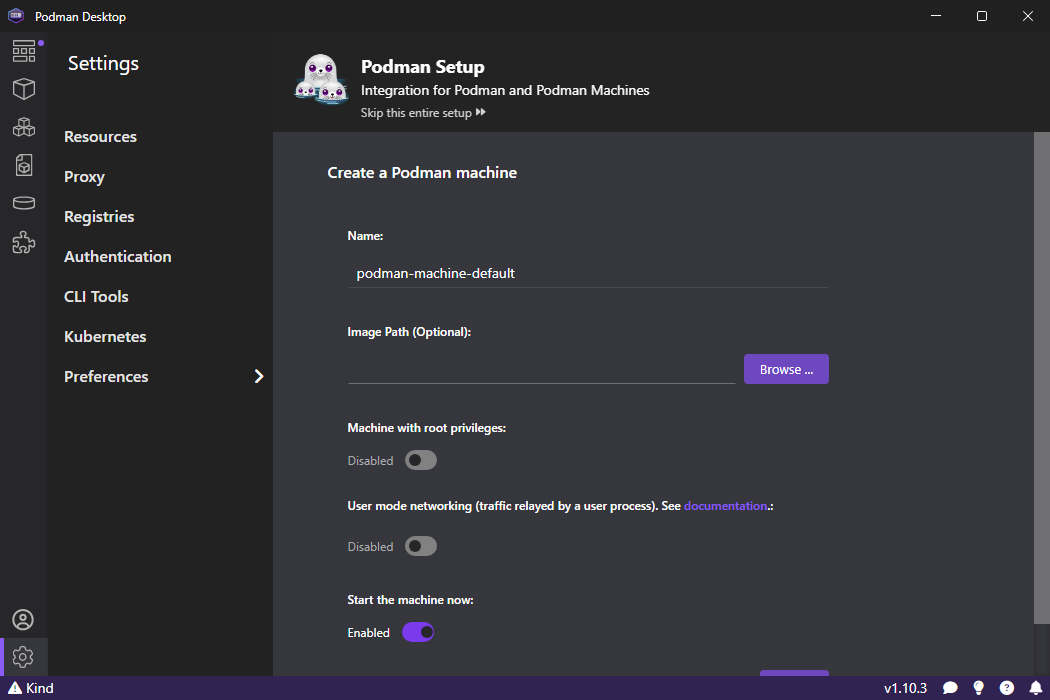 Optional: It is recommended to enable the Autostart setting for Podman. This skips having to launch the Podman engine every time you open Podman Desktop. If you want to change this setting later: