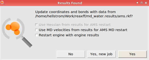 Use MD velocities from results for AMS MD restart: If the original job is a molecular dynamics simulation, this option will load the velocities from the final frame from the original job, allowing you to continue an MD simulation. Note that if you use thermostats or barostats, the continuation trajectory will not perfectly match the trajectory which “would have” taken place if the original job was longer. If you select the option, then on the Model → MD panel, the Initial velocities keyword is set to From File, and the File is set to the ams.rkf file from the original job.