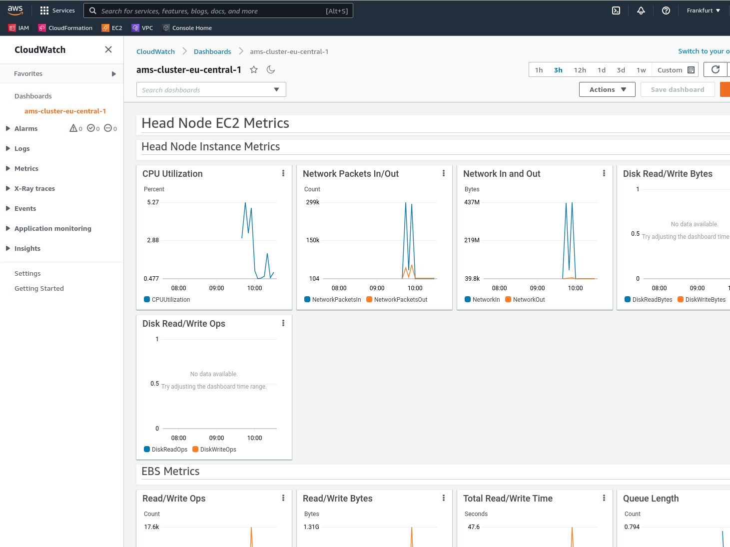 Fig. 4 The cloudwatch dashboard visualizes useful system information about your cluster.¶