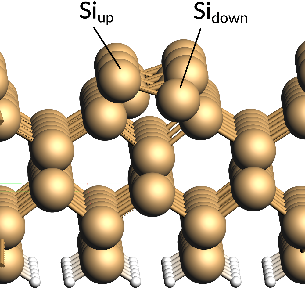 This structure was obtained by cuts along the [001] Miller plane in order to create a six-layer slab. The atoms at the bottom of this slab was then saturated by adding hydrogen atoms at the experimental Si-H bond length of Silane (1.48 Å). The unit cell was extended to form a 2x4 supercell model. This resulting slab model was then relaxed while keeping the bottom two Si-layers and the hydrogen atoms fixed. On the surface of the slab there are two exposed Si-atoms, which form a characteristic alternating buckled structure. A further analysis reveals that this buckling (or symmetry breaking) is the consequence of each of the exposed Si-atoms having an unpaired electron. In consequently, one of these unpaired electrons transfers to the neighboring Si-atom and forming a lone pair with the other unpaired electron there. The Si center where the lone pair is located becomes more nucleophile and gets pushed upwards (Siup) while its more electrophile neighbor (Sidown) moves slightly towards the slab.