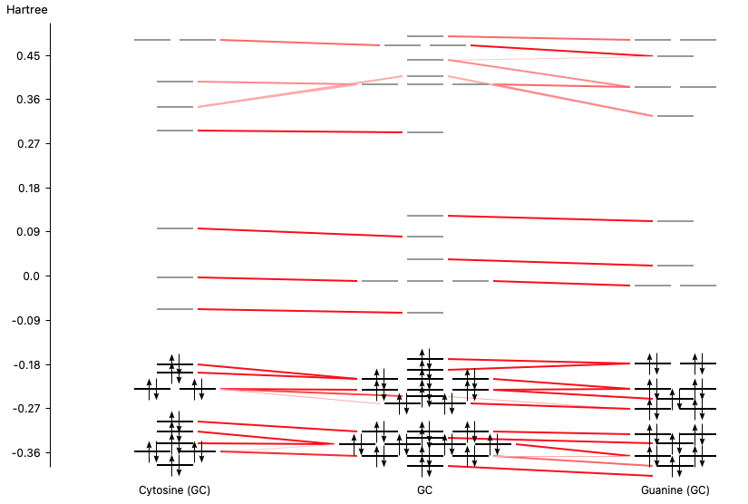 If you move the mouse over a level (orbital) of the Guanine-Cytosine DNA base pair one can find out more detailed information about the composition of the level in terms of the atomic orbitals.