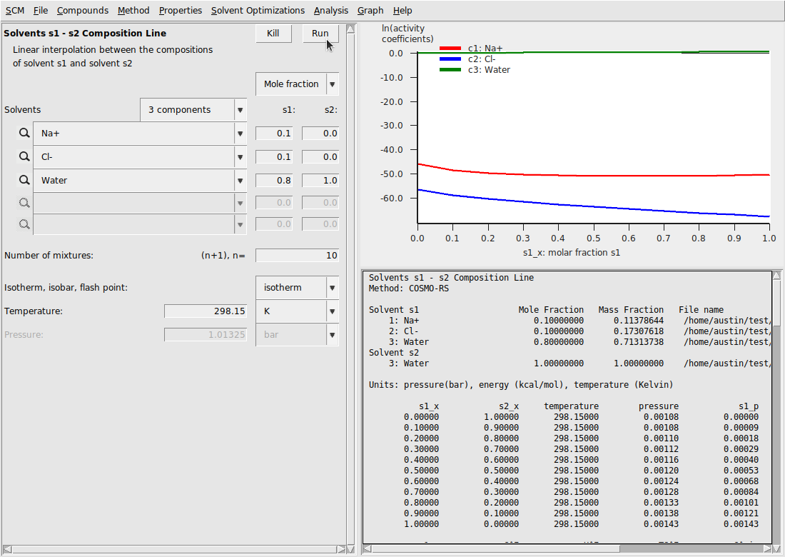 We’ll first consider the simple case of dissociated Na+ and Cl- ions in water. To set up this experiment, first generate COSMO Result Files for Na+, Cl-, and Water (or simply use the water .coskf file in the database). Then setup a s1-s2 composition line calculation with the following: