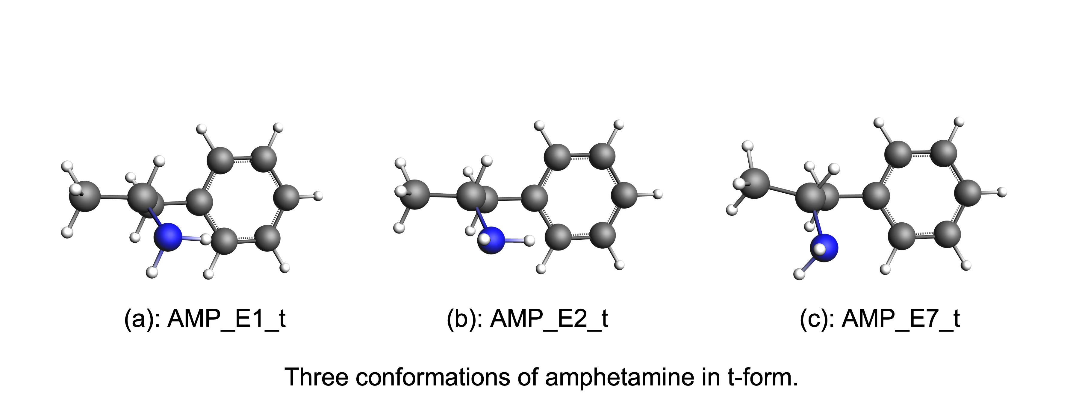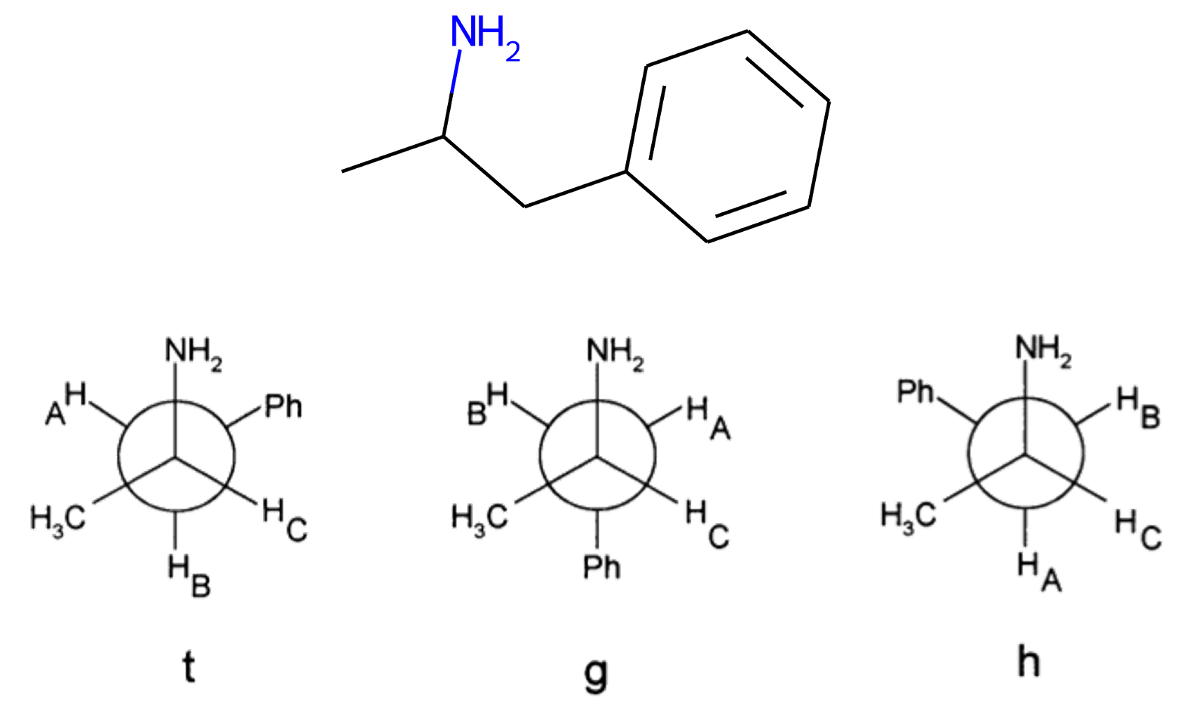 In this example, we will investigate the differences in conformer populations of amphetamine between water and chloroform solvents. Additionally, we will look at how the partition coefficient is affected by accounting for the conformers of amphetamine. Amphetamine has three conformers, denoted in the literature [3] as the t-form, g-form and h-form. These are shown below.