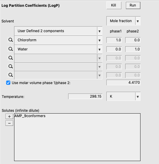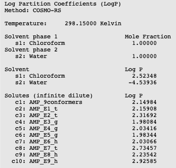 We can additionally do a logP calculation for every individual conformation. Simply delete the .multiform file from the solutes window, add all the individual .coskf files, and then click run. The results show that the calculated logP ranges from 1.98 to 2.92 for the different conformations.