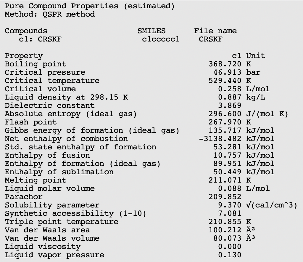 A QSPR (Quantitative Structure-Property Relationship) method can be used to estimate some pure compound properties. This QSPR method needs a SMILES string as input.
