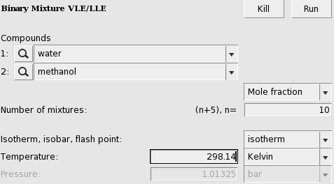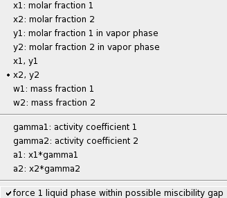 A phase diagram of a mixture of two components can be calculated with Properties → Binary Mixture VLE/LLE. The binary mixture will be calculated for a list of molar fractions between zero and one. This can be done at constant temperature (isothermal) or at constant vapor pressure (isobaric).