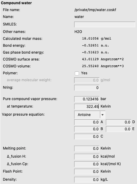 In the compounds window one can also set the vapor pressure of the pure compounds at a given temperature, or set the Antoine parameters. If these values are not specified (if they are zero) then the pure compound vapor pressure will be approximated using the COSMO-RS method. This is relevant, for example, for the calculation of the (partial) vapor pressures of mixtures, calculation of boiling points of mixtures, and calculation of Henry’s law constants.