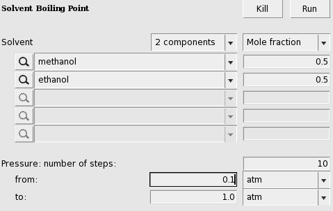 The calculated boiling points (may take several seconds) for a binary mixture of methanol(1) and ethanol(2) will be shown.
