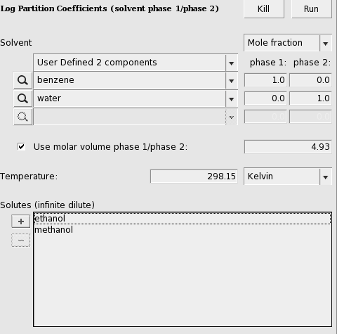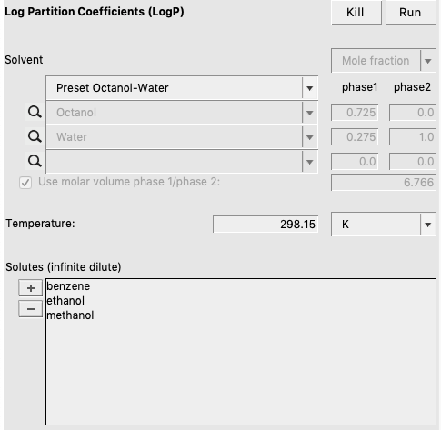 In case of partly miscible liquids, like the Octanol-rich phase of Octanol and Water, both components have nonzero mole fractions. The preset also gives a value for the molar volume quotient of the two solvents.