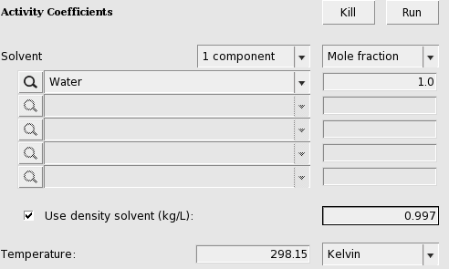 The calculated Henry’s law constants also depend on the vapor pressure of the pure compounds. In the compounds window one can also set these vapor pressures of the pure compounds at a given temperature, or set the Antoine parameters. If these values are not specified (if they are zero) then the pure compound vapor pressure will be approximated using the COSMO-RS method. Best is to include the experimental vapor pressure for a pure compound at the used temperature, thus in this case at 293.15 K.