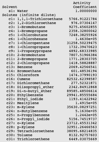 The result of the calculation (may take a few seconds) is given in the form of a table. Note that not all compounds were selected as solutes, otherwise the calculation would take much more time.