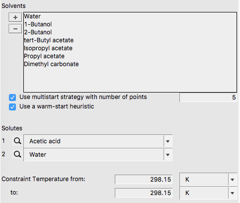 A classic liquid-liquid extraction problem is separating Acetic acid and Water. In this tutorial, we assume that we want to replace a standard solvent for this extraction (n-Hexane) with something more environmentally-friendly. We restrict our problem to the solvents with the fewest issues: Water, 1-Butanol, 2-Butanol, tert-Butyl acetate, Isopropyl acetate, Propyl acetate, and Dimethyl carbonate.