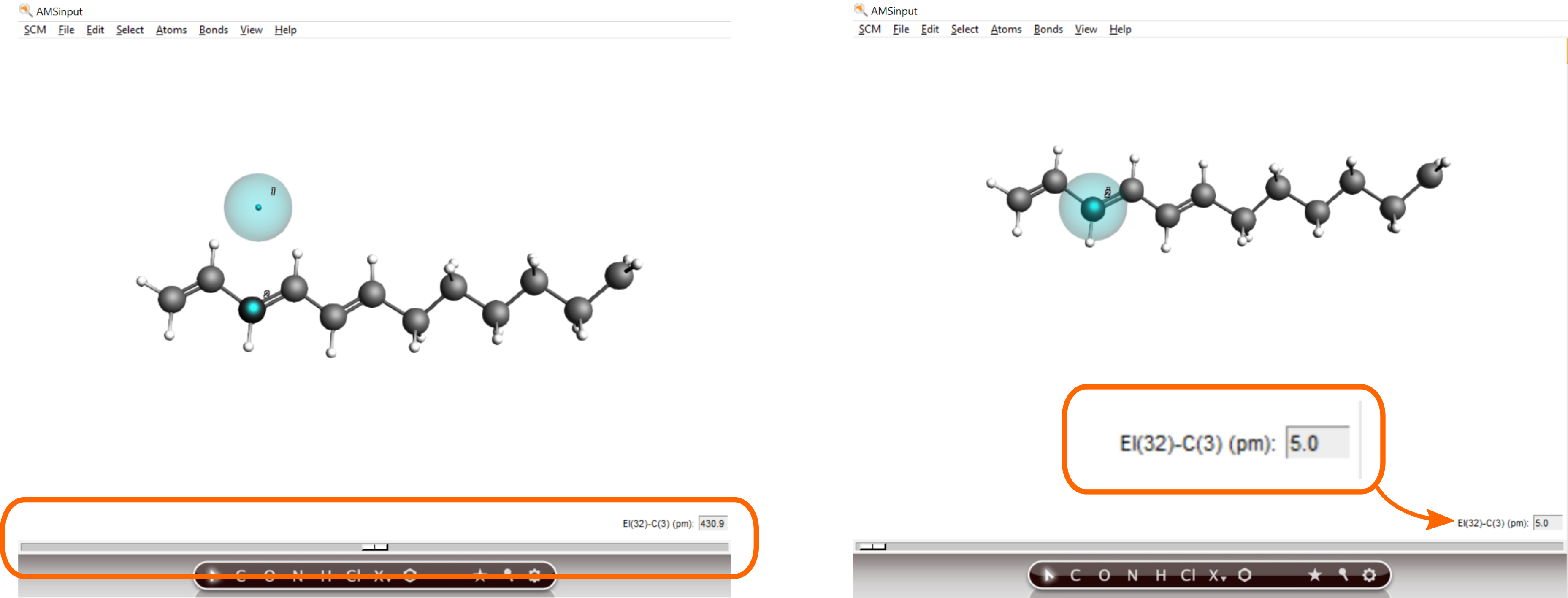 Next, move the electron particle onto its final starting position, which is very close (5 pm) to carbon atom #3.