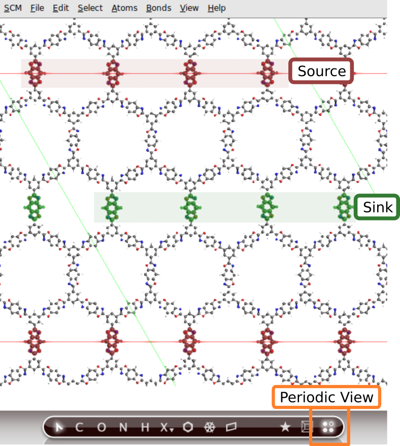 A heat flow is realized by running two local thermostats, heat source and heat sink, inside the same molecular structure. The heat source is set to be 10K above the target temperature, while the heat sink is kept 10K below the target temperature. From the energy collected at the heat sink over time and the cross-sectional area, the heat flux and thermal conductivity can be calculated. Both the molecular structure and the workflow were taken from the combined experimental and theoretical study E.M. Moscarello, B.L. Wooten, H. Sajid, L.D. Tichenor, J.P. Heremans, M.A. Addicoat, P.L. McGrier, ACS Appl. Nano Mater. 2022, 5, 10, 13787–13793.