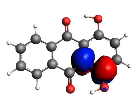 We can see that the lone pairs of the OH oxygen atoms are involved in all DHAQs. In 14-DHAQ the charge is mainly located in the ring carrying both OH groups which is a different behavior. Then we can see for all DHAQs, that the charge transfers to other parts in the molecule and moves to the antibonding C=O orbital, i.e. π*(C=O) but also to some of the π*(C=C).
