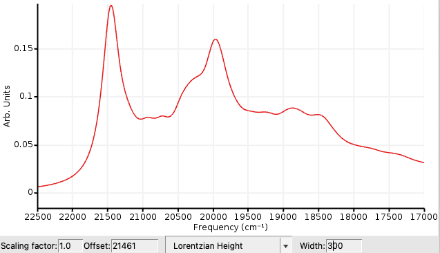 The output will list the spectral intensity from -95000 cm-1 to 500 cm-1 (relative to the 0-0 transition) by taking into account the overlap of the vibronic wavefunction (Franck-Condon factors). The FCF spectrum can be visualized at SCMSpectra. The lines can be Gaussian-broadened to take into account thermal broadening.