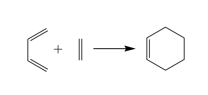 The Diels-Alder reaction mechanism is a click reaction to build six membered rings from scratch using a diene and a dienophile. The simplest six membered ring can be formed with a molecule of butadiene as diene and a molecule of ethene as dienophile which react to form Cyclo-1-hexene.