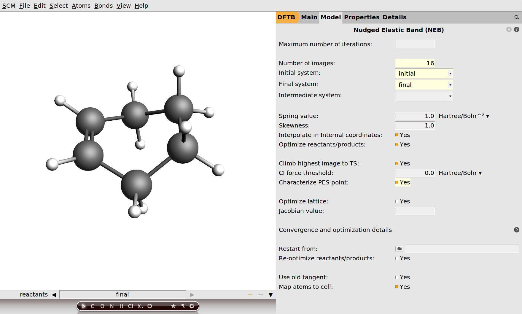Another way to locate a TS would be using the NEB method. This requires you to provide the structure of your reactants and your products. These structures you provide have to have a realistic geometry but do not necessarily have to be minima on the PES. In case of our Diels-Alder reaction we do know about the product but we are uncertain how exactly the diene and dienophile look in their local minima before they “started to click”.