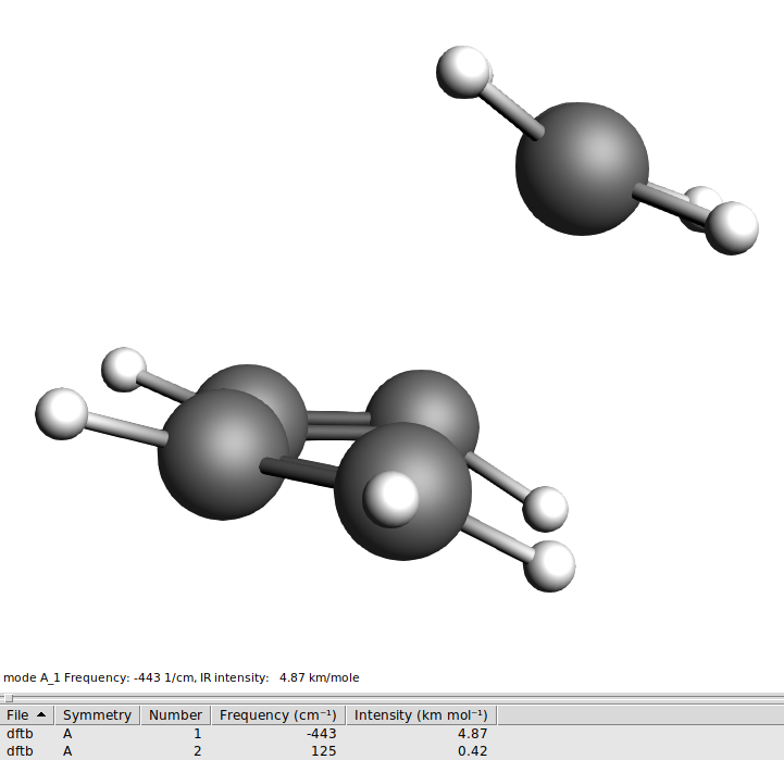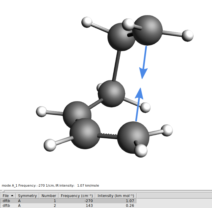 DA_Freq_DFTB.ams.The first mode should have an imaginary frequency (which in the table is shown as a negative frequency). Click on the line in the table corresponding to the imaginary frequency to visualize the mode. You will see C2 and C3 moving towards and away from each other as you would expect them to do in the actual reaction.