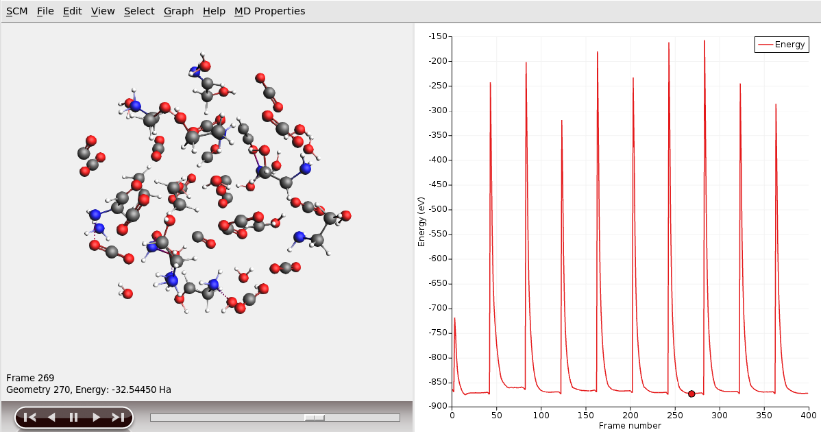 The displayed energy is the total energy including the kinetic and restraint energies. Use Graph → Engine Energy to view the ReaxFF-calculated potential energy without restraints.