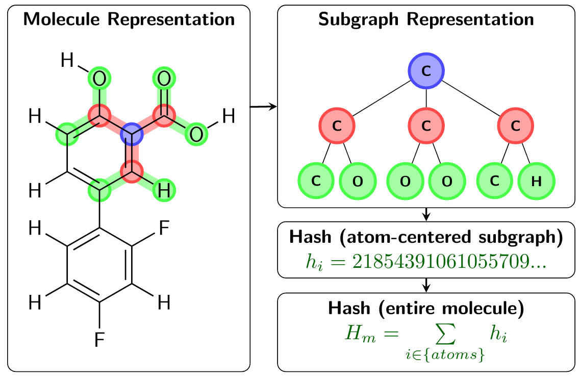 In ChemTraYzer2, reactions are determined to be equivalent using a very straightforward condition: two reactions (R1 and R2) are equivalent if the sets of reactant/product molecules of R1 and the sets of reactant/product molecules of R2 are equivalent. Comparing reactions in this way requires defining the equivalence of two individual molecules, and this is more challenging to assess. In the original ChemTraYzer, molecule equivalence is determined via a comparison of canonical SMILES strings. Though SMILES can represent a large number of chemical structures, they fall short in representing the complete space of chemical reactions. For this reason, ChemTraYzer2 evaluates each molecule using a subgraph-based descriptor, which is generalizable to the complete reactive chemical space. ChemTraYzer2’s subgraph descriptor builds local atomic environments using a breath-first search of each atom in a molecule, evaluates a unique hash value for each atom, and finally sums these hash values to produce a unique hash value for each unique molecule. This is summarized in the figure below.