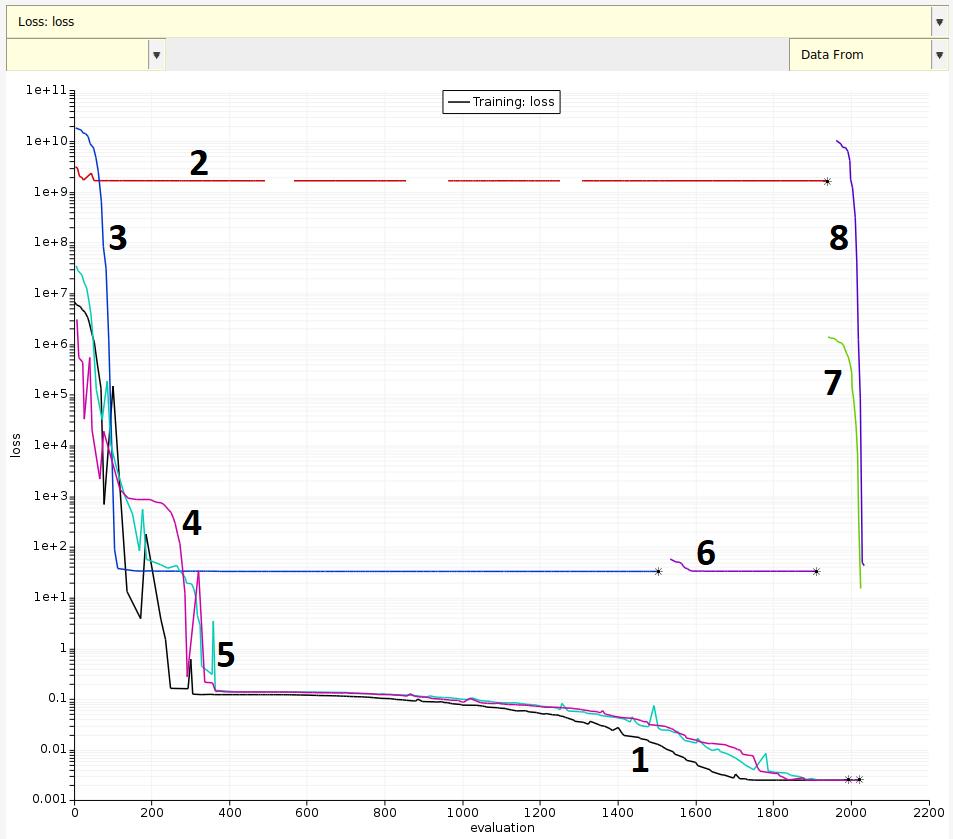 Optimizers 2 and 3 are clearly stuck in bad minima. They appear converged, but at loss values which are much worse than ones being simultaneously explored by optimizers 1, 4 and 5.