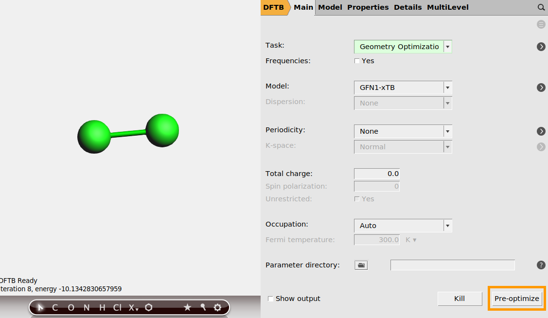 DFTB model ( panel, Model → SCC-DFTB, Parameters →