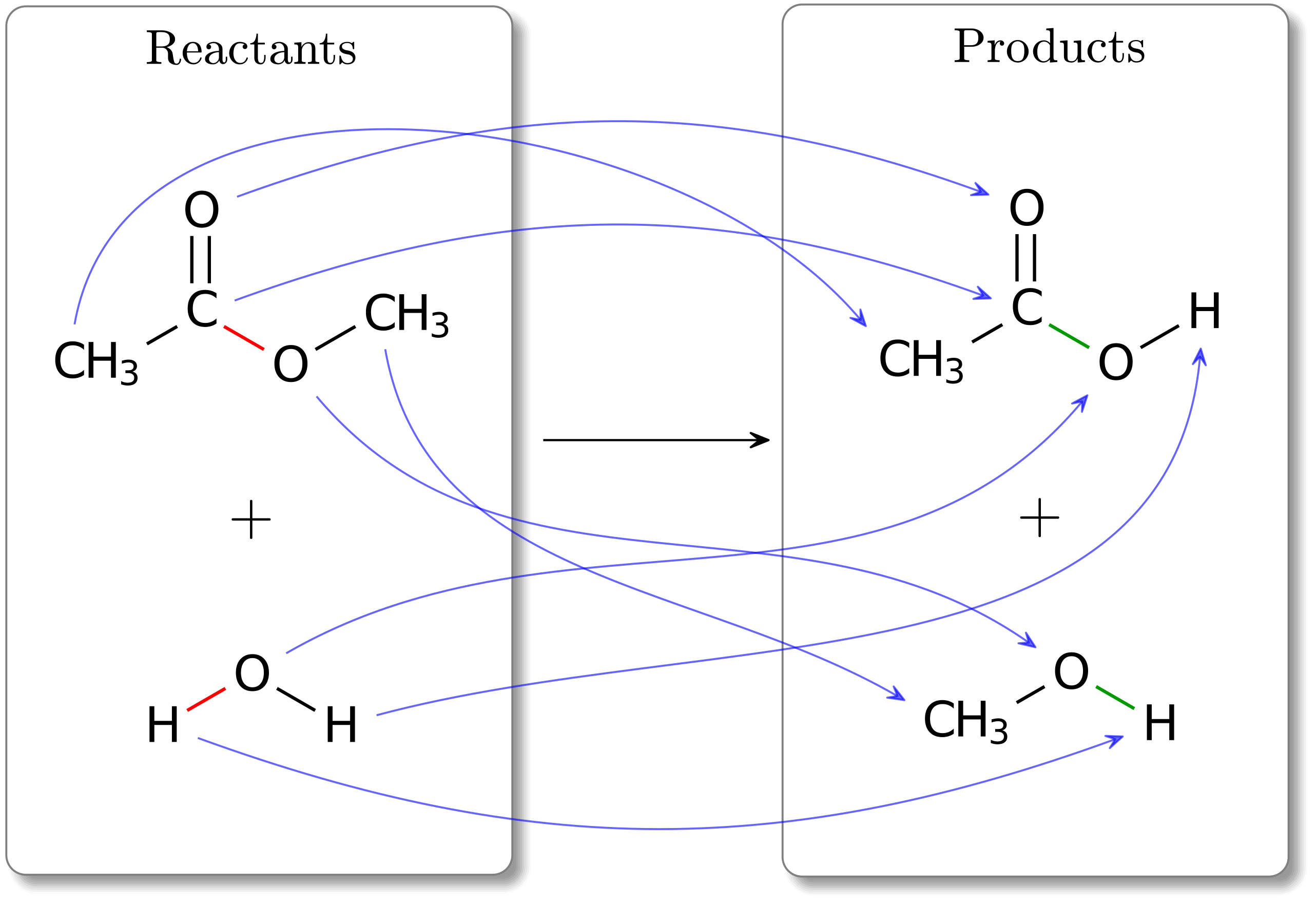 reactmap. To solve this reaction mapping problem, we’ll first input the reactant and product molecules as SMILES strings and then create a reaction instance for the problem. This reaction instance will be given to theMapclass, which will determine the optimal mapping. All results from the mapping are stored in the reaction instance. Below, we’ll take a look at 2 important values: the cost of the mapping (the number of required bond changes); and the mapping itself (the assignment of reactant atoms to product atoms). Note that the indices of the mapping list correspond to the atom indices of the reactants. The entries are the atom indices in the products. Additionally, we’ll print some more descriptive output and generate some useful images illustrating the mapping.>>> import scm.reactmap as rm >>> reactant = rm.Molecule(smiles="CC(=O)OC.O") >>> product = rm.Molecule(smiles="CC(=O)O.CO") >>> reaction = rm.Reaction(reactant = reactant, product = product, name = "hydrolysis") >>> rm.Map(reaction) >>> print(reaction.cost) 4 >>> print(reaction.mapping) [0, 1, 3, 2, 4, 5, 6, 7, 8, 10, 11, 12, 13, 9] >>> reaction.show_results() Results for hydrolysis -> Problem details: Number of atoms : 14 Atom counts : C:3, O:3, H:8 Number of reactant bonds : 12 (12 active) Number of product bonds : 12 (12 active) -> Atom mapping details: Reactant Product Atom Atom Status index index type (A/I/D) ───────────────────────────────────────── 0 -> 0 C A 1 -> 1 C A 2 -> 3 O A 3 -> 2 O A 4 -> 4 C A 5 -> 5 O A 6 -> 6 H A 7 -> 7 H A 8 -> 8 H A 9 -> 10 H A 10 -> 11 H A 11 -> 12 H A 12 -> 13 H A 13 -> 9 H A ───────────────────────────────────────── -> Bond change details: Broken: O-C bond between atoms 3 and 4 in the Reactants Broken: O-H bond between atoms 5 and 13 in the Reactants Formed: C-O bond between atoms 4 and 5 in the Products Formed: O-H bond between atoms 3 and 9 in the Products (Total broken: 2, Total formed: 2) -> Solution details: Found solution : True Time to find solution : 0.022364 s Cost : 4