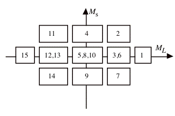 The presence of a determinant with ML = 2, MS = 0 and no ML = 2, MS 0 determinant indicates the presence of a 1 D multiplet, and E(1 D) = E(D1 ). There is also a 3 P, the determinant with MS = 1, ML = 1. We should have E(3 P) = E(D2 ) = E(D4 ). The two determinants D3 and D6 in the MS = 0, ML = 1 box will mix, and the solutions of the 2 by 2 secular problem will be E(1 D) and E(3 P). Since the sum of the eigenvalues is equal to the sum of the initial diagonal elements, we have E(1 D) + E(3 P) = E(D3 ) + E(D6 ). We should also have E(D3 ) + E(D6 ) = E(D1 ) + E(D2 ). Such a relation provides a test on the consistency of the results. Finally we have the MS = 0, ML = 0 block. The sum of the energies of D5 , D8 and D10 should be the sum of the energies of 1 S, 3 P and 1 D. Since E(3 P) and E(1 D) are already known, E(1 S) can be calculated.