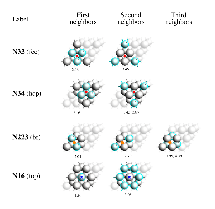 The figure below depicts the four types of binding sites observed on a Pt(111) surface. There, you can see the AMS label (e.g., N33, N34, …) as well as the traditional one (e.g., fcc, hcp, …). The distances between the binding site and the highlighted atoms on that coordination shell (or neighborhood) are listed below each geometry. If two numbers are listed, it is because two different distances are involved, but they are considered in the same coordination shell because their difference is less than PESExploration%BindingSites%DistanceDifference.