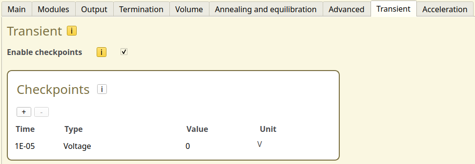 We will move to the Transient Parameters tab to configure the voltage switch. We create a new checkpoint at 10 microseconds, at which time the voltage will be set to 0 V.