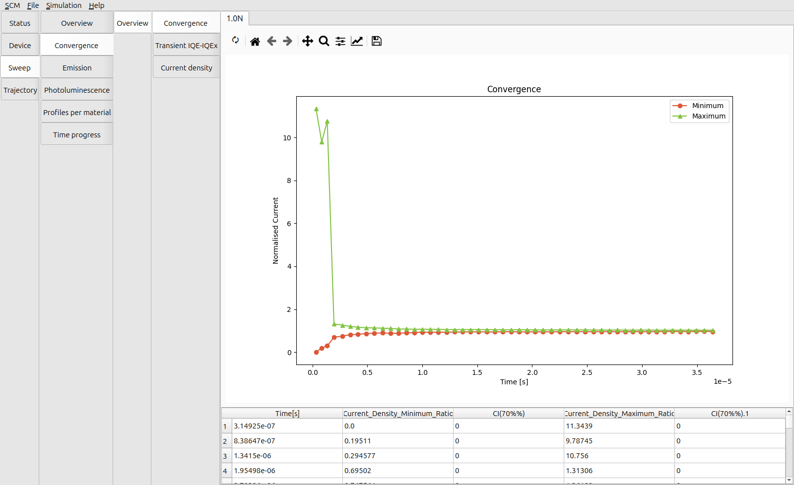 After the simulation has concluded, we can view the output with BBresults (SCM → BBresults). Transient current profiles can be viewed in the Sweep → Convergence → Overview section.
