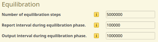 The pre-equilibration is configured in the Annealing and Equilibration tab. We set a number of equilibration steps equal to 5 times the output interval. As with the voltage ramp, custom report and output intervals may be specified during the pre-equilibration stage. As we are interested in the dynamic behavior here, we will use the regular simulation intervals.
