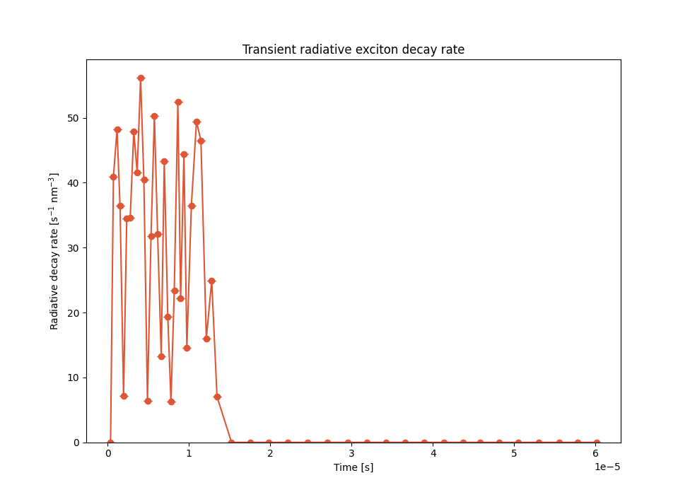 Once the circuit has been disconnected, a rapid drop in charge density is observed. Emission events (Sweep → Time Progress → Excitonic → Transient Radiative Exciton Decay Rate) continue to occur during a small window of time (around 5 microseconds). The residual charges in the device recombine near the emitters, causing the depletion of charges in the device.