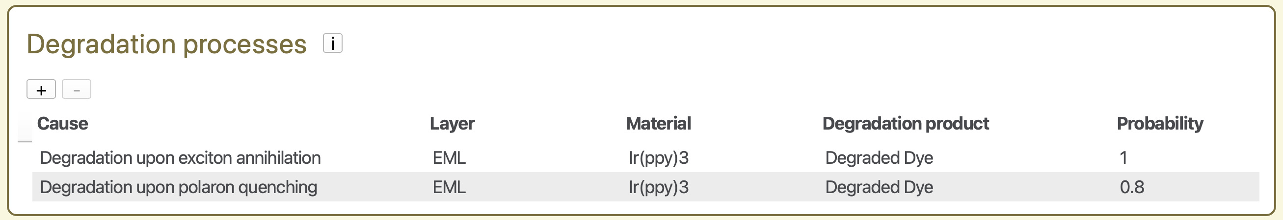 In the Degradation processes table of the stack editor, specify the excitonic events that can trigger degradation of the materials.