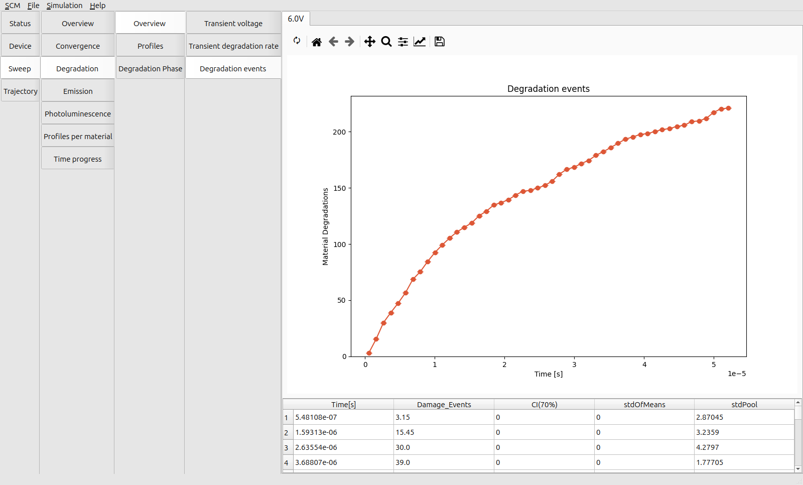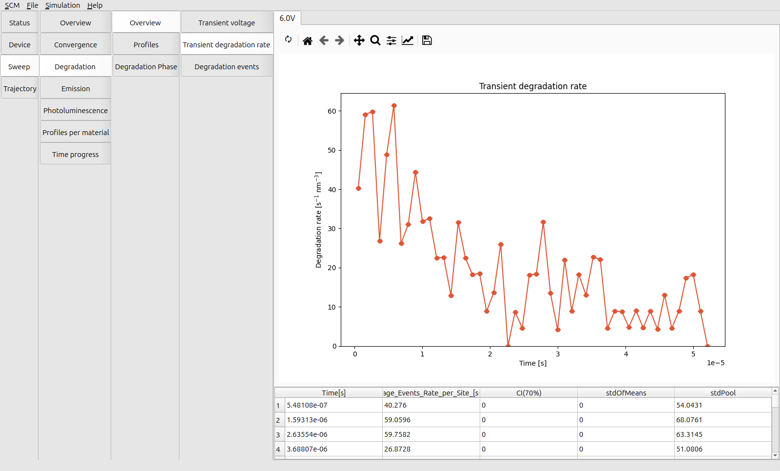Monitor the progress of the simulation using BBresults (SCM → BBresults). Device degradation statistics are found in the Sweep → Degradation section.